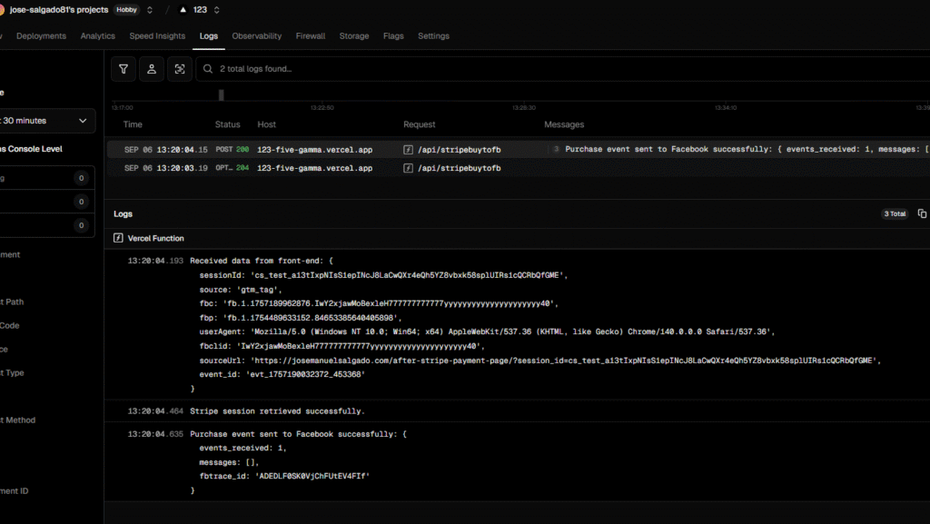 I get 3 answers, one confirms having sent the data, the second confirms the stripe session access and the 3rd confirms successful post to FB CAPI: